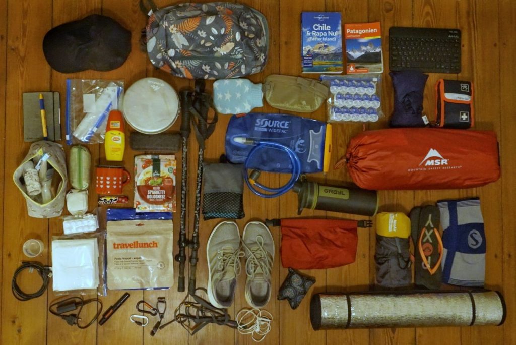 Weitere Ausrüstung: ThermaRest, isolierende Isomatte, Erste-Hilfe-Set, Clips und Karabiner, Seidenschlafsack, Daunenschlafsack (Komfort bei 0 Grad), Kocher, Topf, Tasse, Schweizer Taschenmesser, Stift & Block, Wanderstöcke, Tastatur, Powerbank, Reiseführer, Wanderführer, kleiner Rucksack, Brillenetui, Kontaktlinsen, Outdoor-Sonnenbrille, diverse Ladekabel, FlipFlops, 2 Mikrofaserhandtücher, Drybag, Gefrierbeutel, Kopfhörer, 3 Fertigessen und ein paar Fertigsaucen sowie leichte Sportschuhe