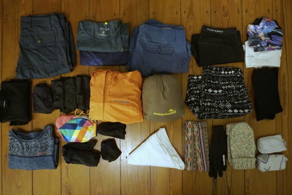 Weitere Kleidungsstücke: Daunenjacke, Regenjacke, lange dünne Hose mit Gummizug für warme Tage, kurze Wanderhose, Merino-Langarmshirt zum Wandern, Merino-Lamgarmshirt für abends, Schlauchschal, Baumwolldreieckstuch in weiß, dünne Handschuhe, Wollhandschuhe, Wandersocken, Unterwäsche, Bikini, Sport-BHs, Kompressionssocken für den Flug und zum Entspannen der Beine nach langen Wandertagen