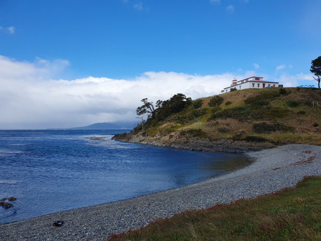 Am Ende der Straße, etwa 4 km vor dem Leuchtturm, steigen wir aus dem Auto aus und beginnen gemeinsam unsere Wanderung. Das Gehen am Strand ist nicht zu unterschätzen, die Schritte verlaufen sich sprichwörtlich im Sand. Es kommt ein böiger, teilweise kräftiger Wind hinzu – da schützt auch der direkt am Wasser endende Wald nicht. Zuguterletzt fängt es, diesmal leider sehr beständig, kräftig an zu Regnen, gemischt mit Schneeflocken, und wir vier sind innerhalb von zwanzig Minuten durchnässt. Meine Regenjacke hat den Härtetest zum Glück bestanden, denn ich musste für diese Reise eine neue anschaffen. Die alte war schon bei den Alpenwanderungen letztes Jahr nicht mehr dicht. Es kommen uns ein paar Leute entgegen, die ihre Wanderung aufgrund des Wetters abbrechen. Wir besprechen uns kurz und entscheiden weiterzugehen. Das Wetter bestätigt uns und kurze Zeit später lässt der Regen nach und unsere Sachen können, trotz weiteren Regens, aufgrund des starken Windes langsam trocknen. Als die Sonne rauskommt, jubeln wir laut und genießen den Blick auf die Magellanstraße. Kurze Zeit später werden wir sogar mit dem Anblick einer Delfinschule belohnt. Das polnische Pärchen schlussfolgert: jetzt haben wir alles gesehen, jetzt kann man zufrieden sein.