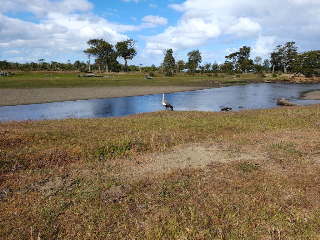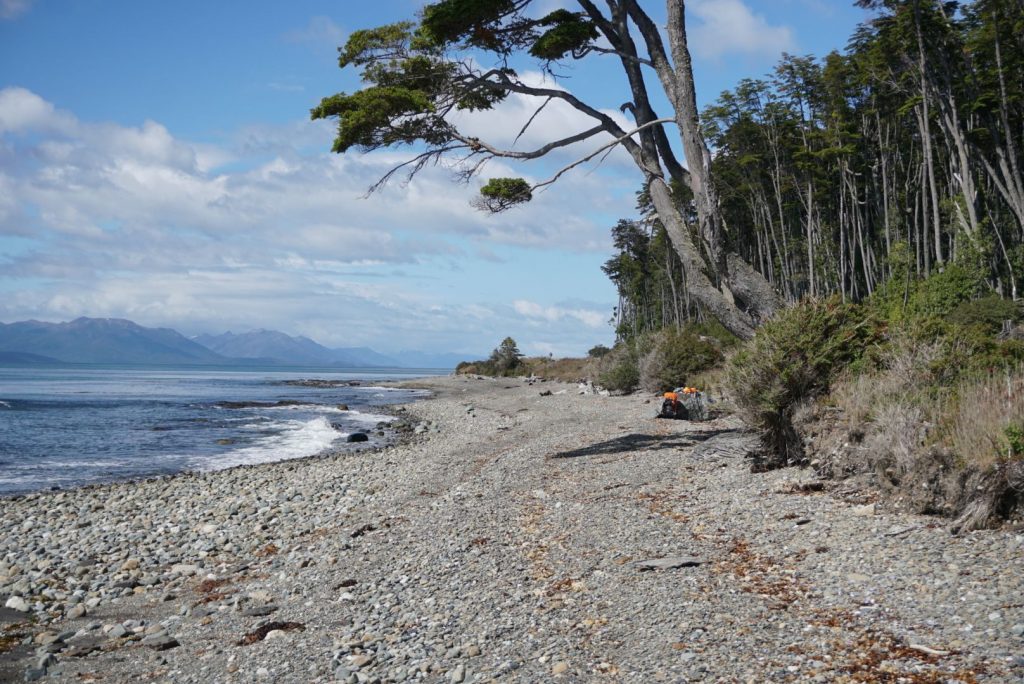 Die Landschaft ist geprägt von dichtem Wald, Kiesstränden, klarem Wasser und einer breiten Schotterstraße. Auf der anderen Seite der Magellanstraße zeichnen sich dunkel bis kaum erkennbar Hügellandschaften ab. Bis San Juan gibt es immer wieder kleine Ansammlungen einfachster Behausungen. Dahinter nur noch Wald zur rechten und Strand und Meer zur linken Seite. Später erfahre ich, dass in der Gegend Gauchos (Cowboys) leben und Pferde und Kühe halten. Auch sehe ich immer wieder Cabañas, einfach Hütten, die man anmieten kann bzw. die Vereinen oder Organisationen gehören, wie z.B. die Staatsbank (Banco Estado) hat hier so etwas wie ein Feriendorf. Empfang habe ich hier unten, außer am Leuchtturm, nicht. Entsprechend ist es gut, dass ich den inReach Mini dabei habe und Krischan immer mal Check-In Nachrichten schicken kann. Die GPS-Daten sind da immer automatisch mit dabei.