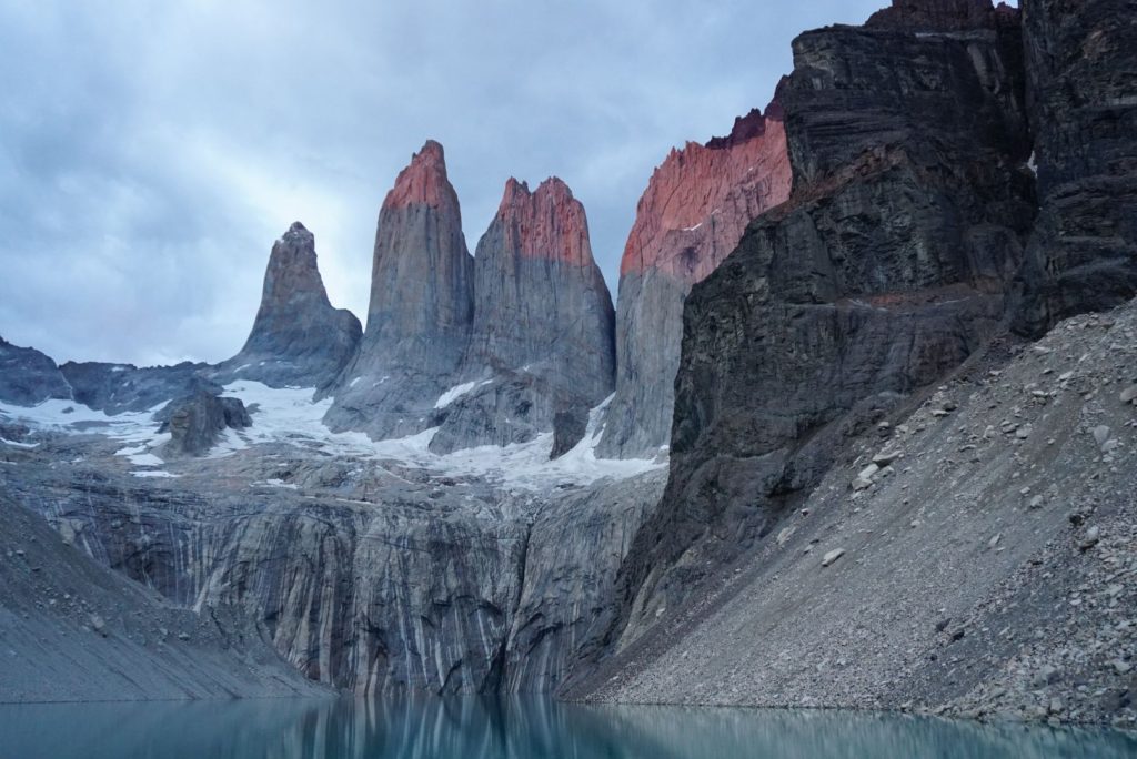 Da es am Tag des Übergangs von Paine Grande nach Francés sehr stark regnete, verlegte ich kurzerhand den Aufstieg zum Mirador Francés auf den nächsten Tag. Die Aussicht auf den Cerro Paine Grande und seinen Gletscher Francés waren spektakulär und lohnenswert. Doch das Verlegen auf den nächsten Tag bedeutete, dass ich am 4. Tag des Treks 10 km ohne den großen Rucksack und 16 km mit großem Rucksack zurücklegen musste. Am Camp Central kam ich gegen 19 Uhr an, fiel um 22.30 Uhr ins Bett und stand um 1.30 Uhr wider auf, um um 2 Uhr zum Sonnenaufgang am Mirador de Las Torres zu starten. Der Aufstieg dauert knapp 4 Stunden, wenn man sehr zügig geht, denn es müssen 11 km und 950 Höhenmeter zurückgelegt werden. Ich kam pünktlich oben an, kuschelte mich in meinen Schlafsack (es war um die Uhrzeit natürlich eiskalt dort oben) und wartete zusammen mit knapp 80 anderen (das ist wenig für dort oben) auf rot angeleuchtete Berggipfel. Da es ein paar kleinere Wölkchen gab, war der Sonnenaufgang nicht ganz so spektakulär wie erhofft, und dennoch hat sich der nächtliche Aufstieg mehr als gelohnt.