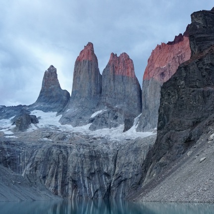 Da es am Tag des Übergangs von Paine Grande nach Francés sehr stark regnete, verlegte ich kurzerhand den Aufstieg zum Mirador Francés auf den nächsten Tag. Die Aussicht auf den Cerro Paine Grande und seinen Gletscher Francés waren spektakulär und lohnenswert. Doch das Verlegen auf den nächsten Tag bedeutete, dass ich am 4. Tag des Treks 10 km ohne den großen Rucksack und 16 km mit großem Rucksack zurücklegen musste. Am Camp Central kam ich gegen 19 Uhr an, fiel um 22.30 Uhr ins Bett und stand um 1.30 Uhr wider auf, um um 2 Uhr zum Sonnenaufgang am Mirador de Las Torres zu starten. Der Aufstieg dauert knapp 4 Stunden, wenn man sehr zügig geht, denn es müssen 11 km und 950 Höhenmeter zurückgelegt werden. Ich kam pünktlich oben an, kuschelte mich in meinen Schlafsack (es war um die Uhrzeit natürlich eiskalt dort oben) und wartete zusammen mit knapp 80 anderen (das ist wenig für dort oben) auf rot angeleuchtete Berggipfel. Da es ein paar kleinere Wölkchen gab, war der Sonnenaufgang nicht ganz so spektakulär wie erhofft, und dennoch hat sich der nächtliche Aufstieg mehr als gelohnt.